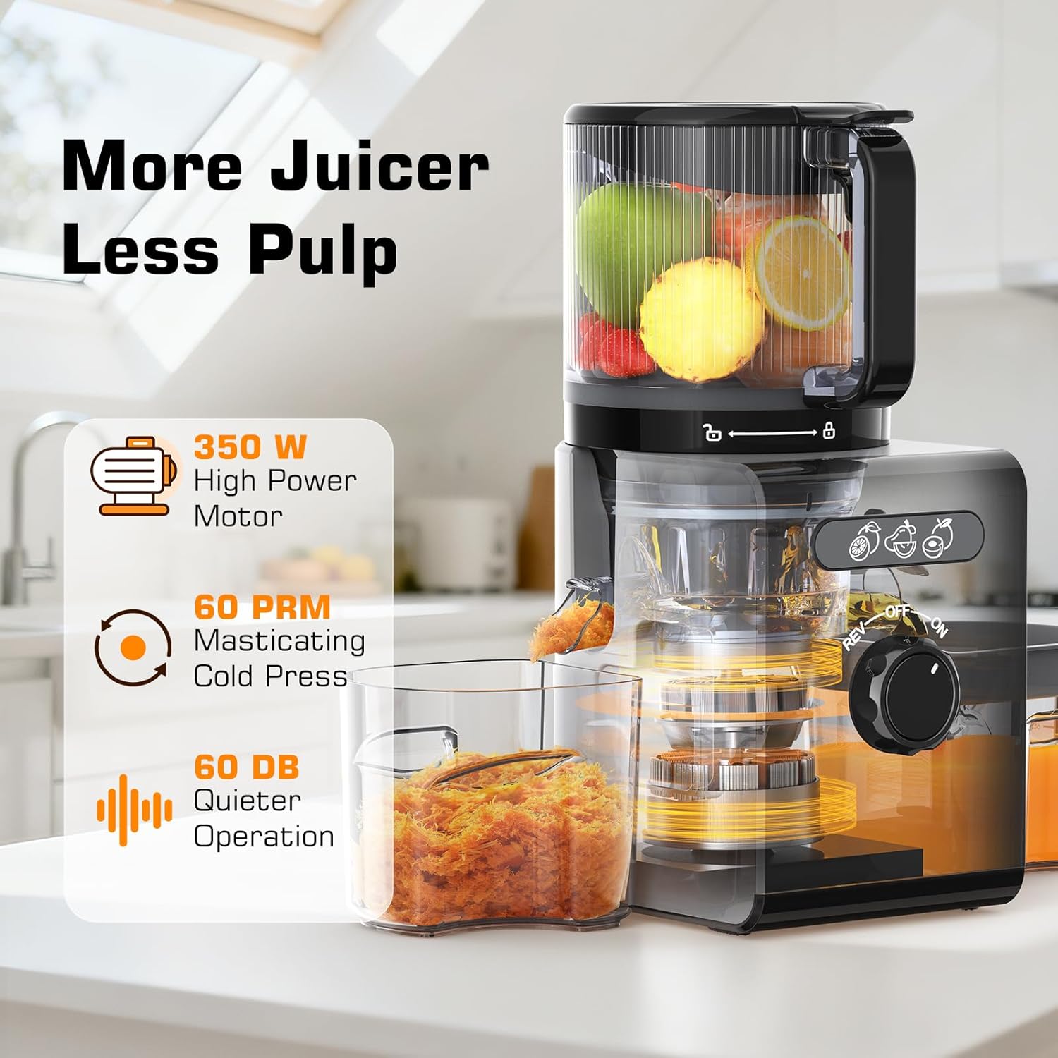 More Juice, Less Waste – 350W + 60 RPM Slow Masticating gets every drop of juice out (drier pulp!) while keeping vitamins intact. Truly satisfying, no more wasting good produce