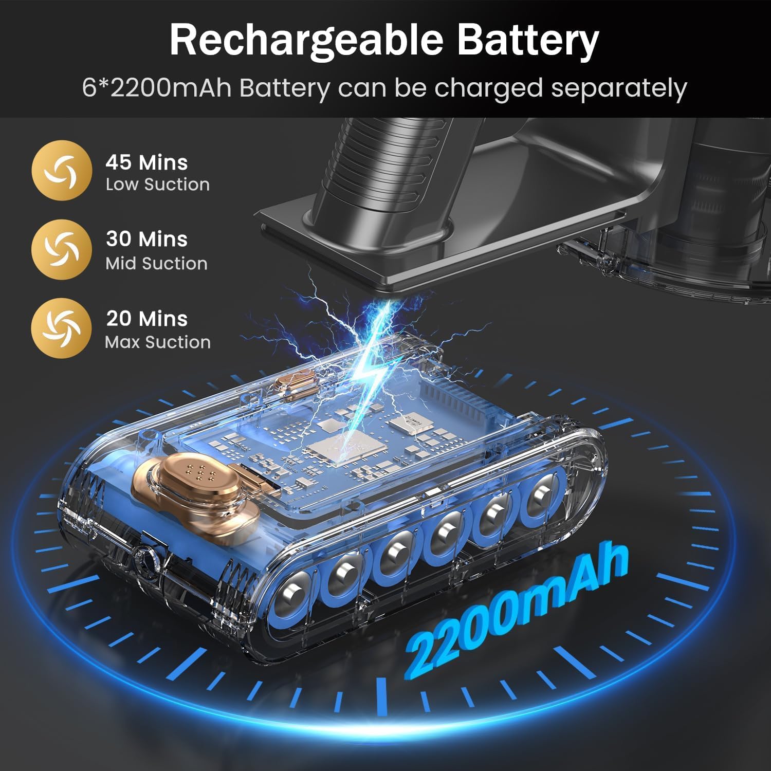 [45min Long Battery Life & Powerful Suction] Equipped with a 2200mAh detachable battery, NuYupo DHC100 cordless vacuum cleaner delivers up to 45 minutes of runtime (in Eco mode). The 480W brushless motor provides powerful suction for easily removing dust, debris, and pet hair from carpets hardwood floors, and tiles.