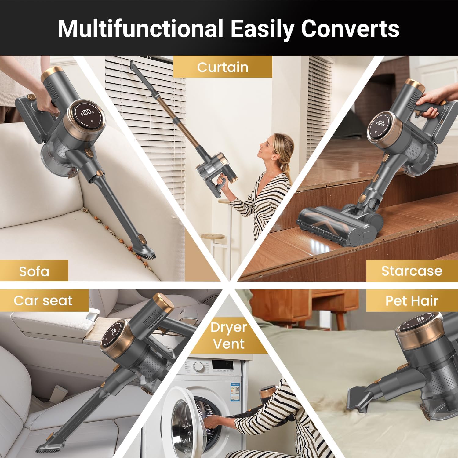 [10 in 1 Multifunctional Vacuum] NuYupo DHC100 Cordless stick vacuum weighing less than 5 pounds, which is effortless to maneuver and handle, without putting strain on your back. Equipped with Combination Brush, Pet Hair Brush, Dryer Vent Cleaner, it can be transformed into a handheld vacuum in seconds. Now, curtains and cobwebs are no longer beyond reach. Lint and debris in the crevices of sofas and dryer vents will have no place to hide.
