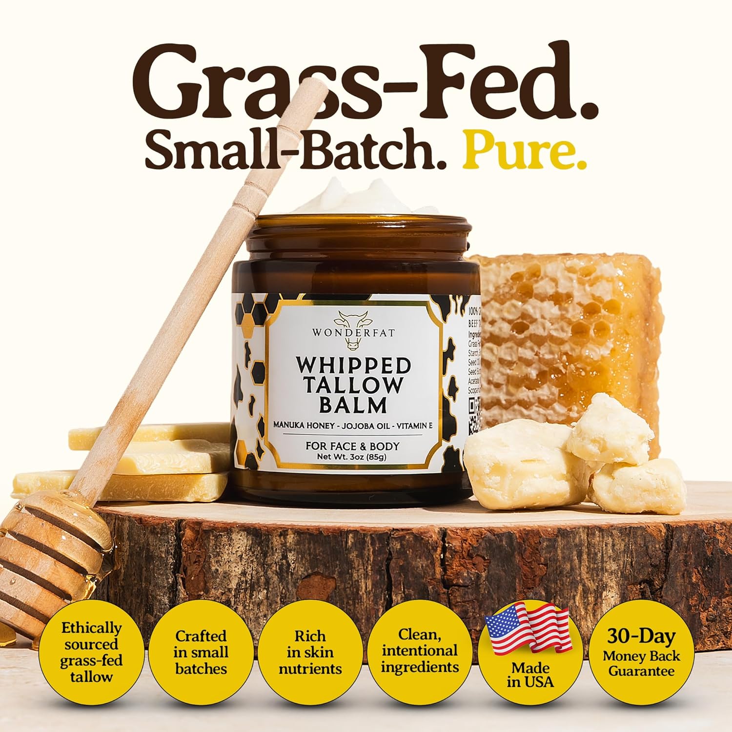 Grass-Fed Whipped Tallow Balm, Face and Body Moisturizer with Manuka Honey, Fragrance Free Tallow Moisturizer for Sensitive Skin, Lightweight Tallow Cream, 3 oz