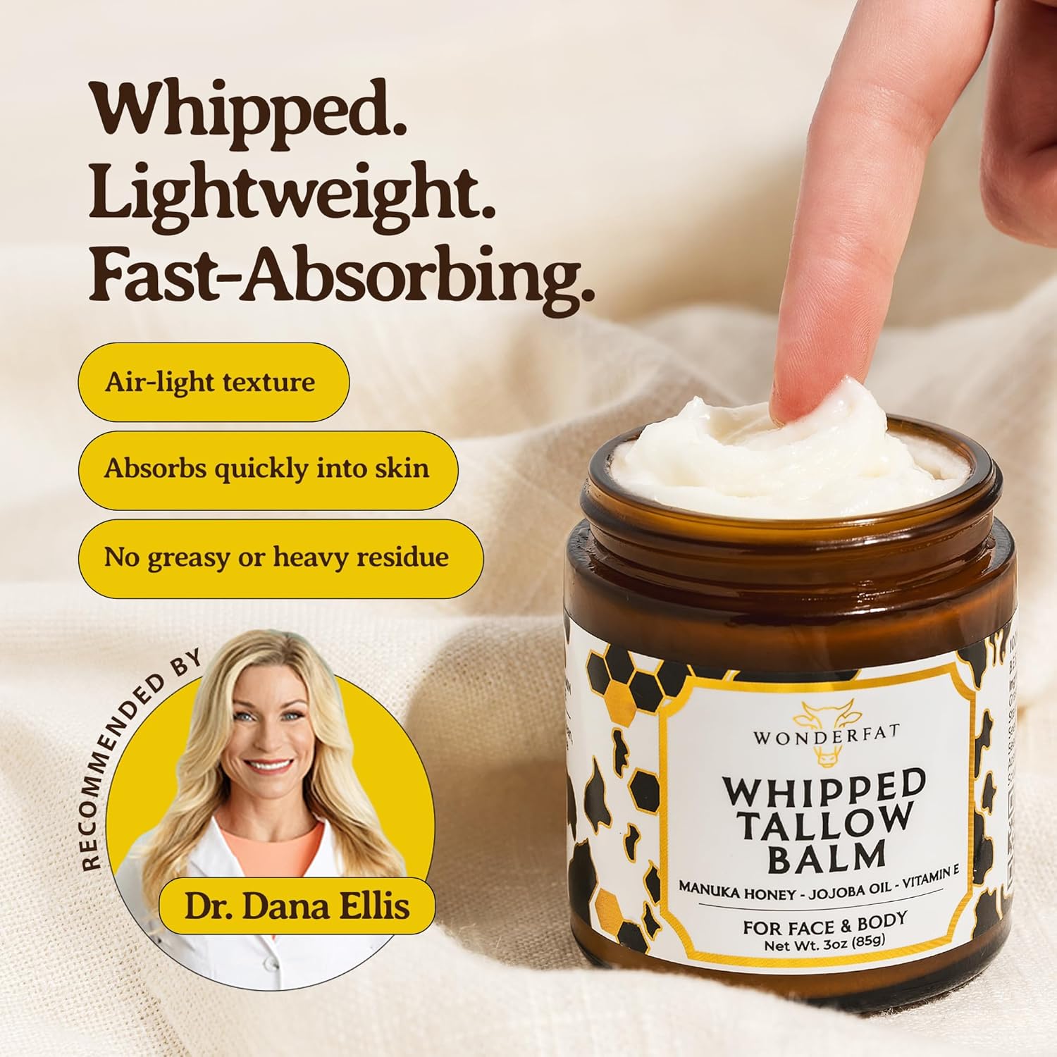 Silky, Lightweight Whipped Texture: Slow-whipped, grass-fed beef tallow blended into a soft, airy balm that absorbs quickly without grease. Delivers comfortable hydration for face and body, leaving skin smooth, breathable, and naturally balanced.