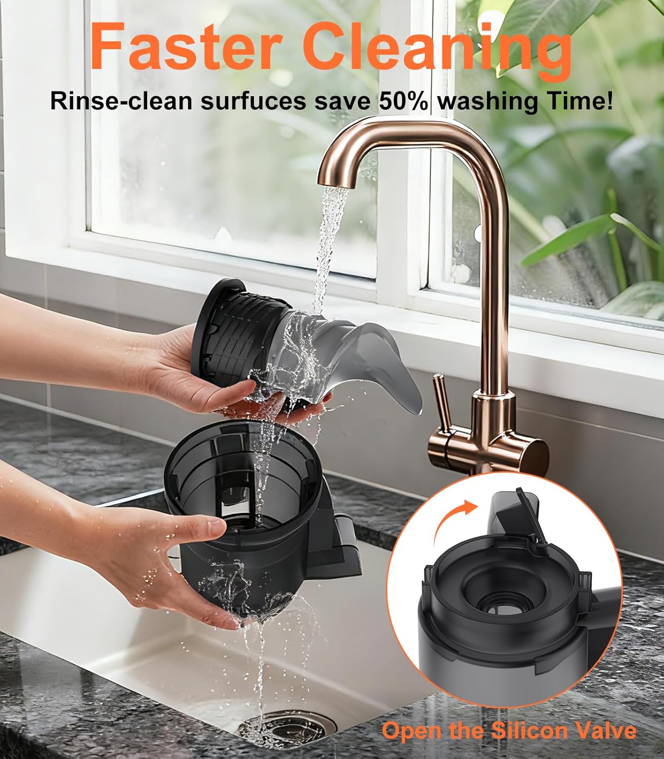 【5.3 Inch Extended Feed Chute】This masticating juicer with 5.3 inch large feed chute enough for whole vegetabels and fruits, no need to pre-cut. What’s more, the design of juice and pulp seperation requirs no maunal filteration. Saving time and efficiency to juice daily