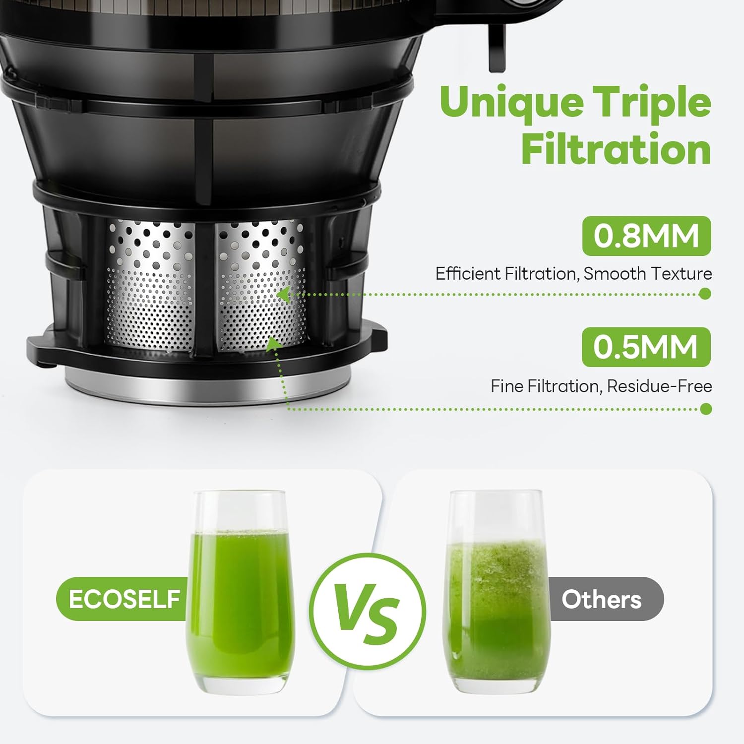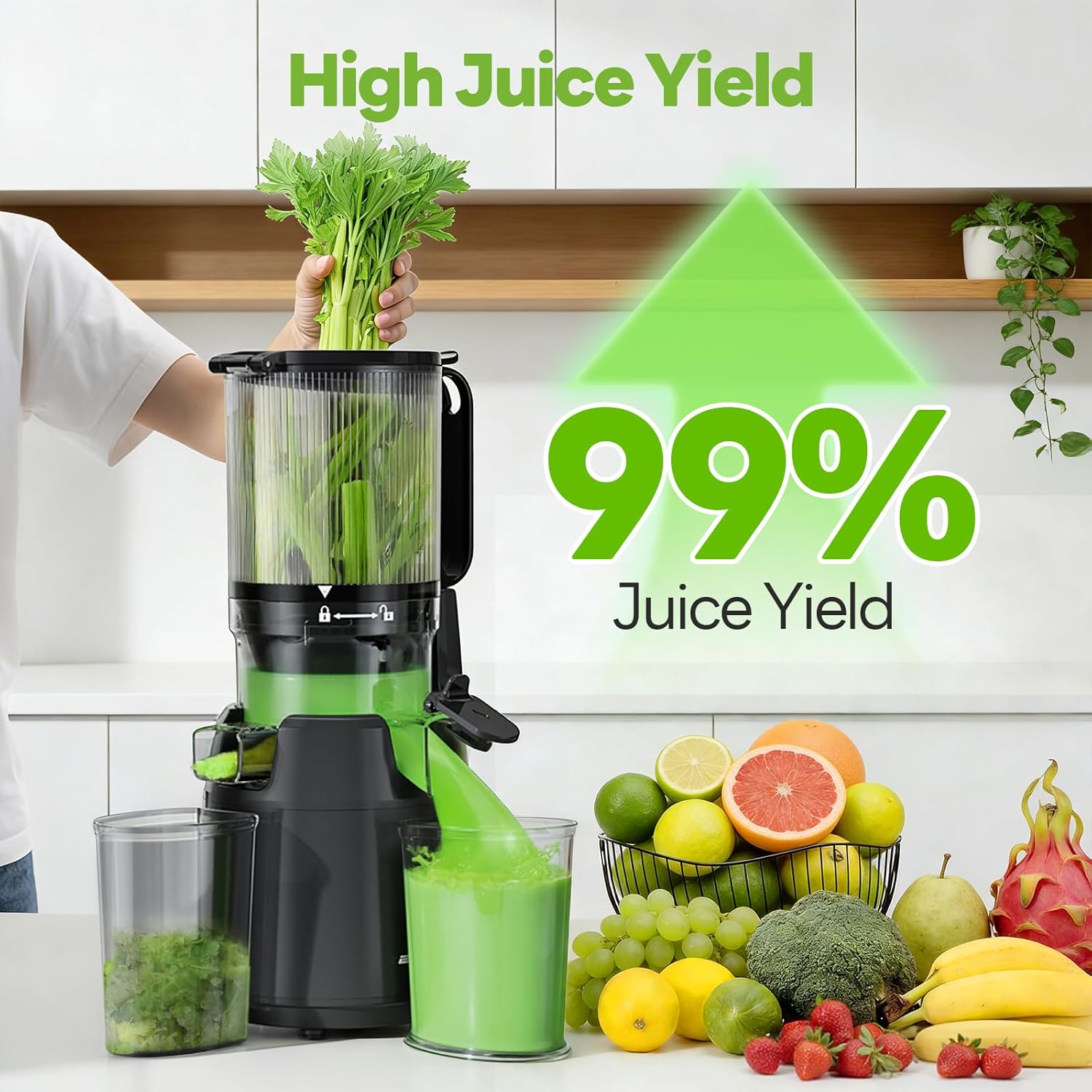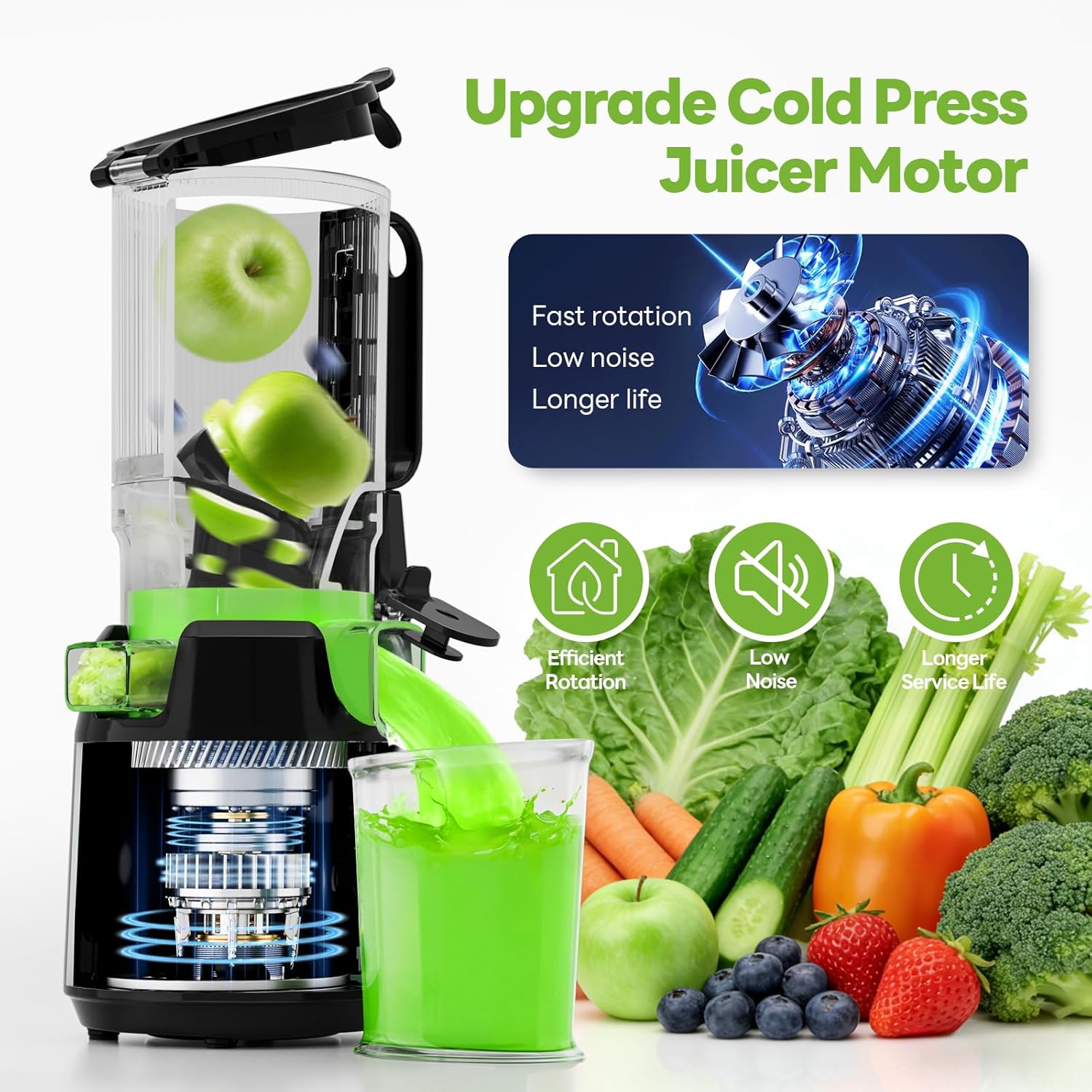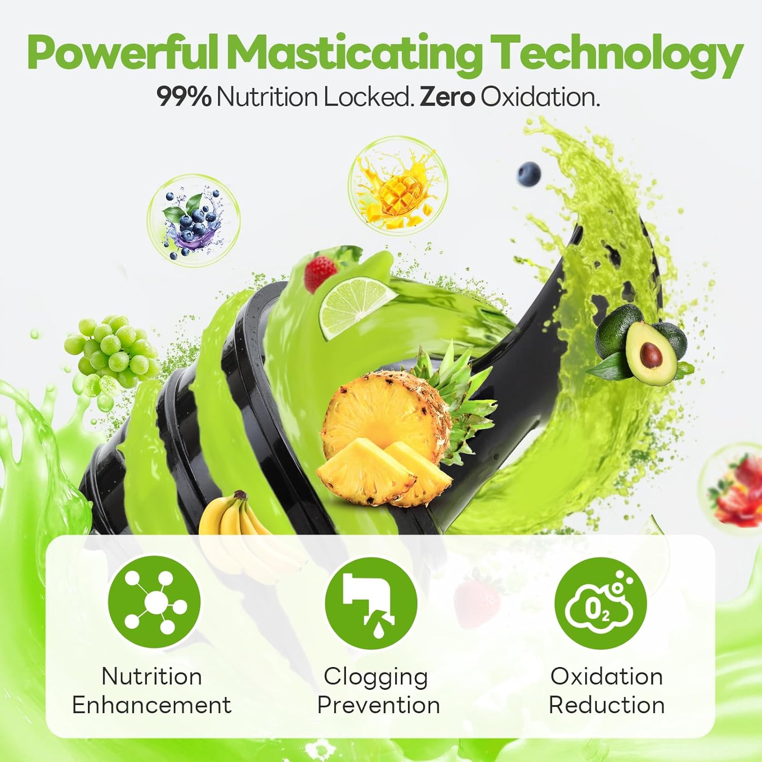 【Upgraded Slow Masticating Technology】 Advanced slow-speed extraction helps preserve vitamins, enzymes, and antioxidants while minimizing oxidation. Enjoy smoother, pulp-free juice from fruits and vegetables with our juicer machines vegetable and fruit design.(The package includes a food pusher that helps guide ingredients into the auger for better crushing and more thorough juice extraction.)