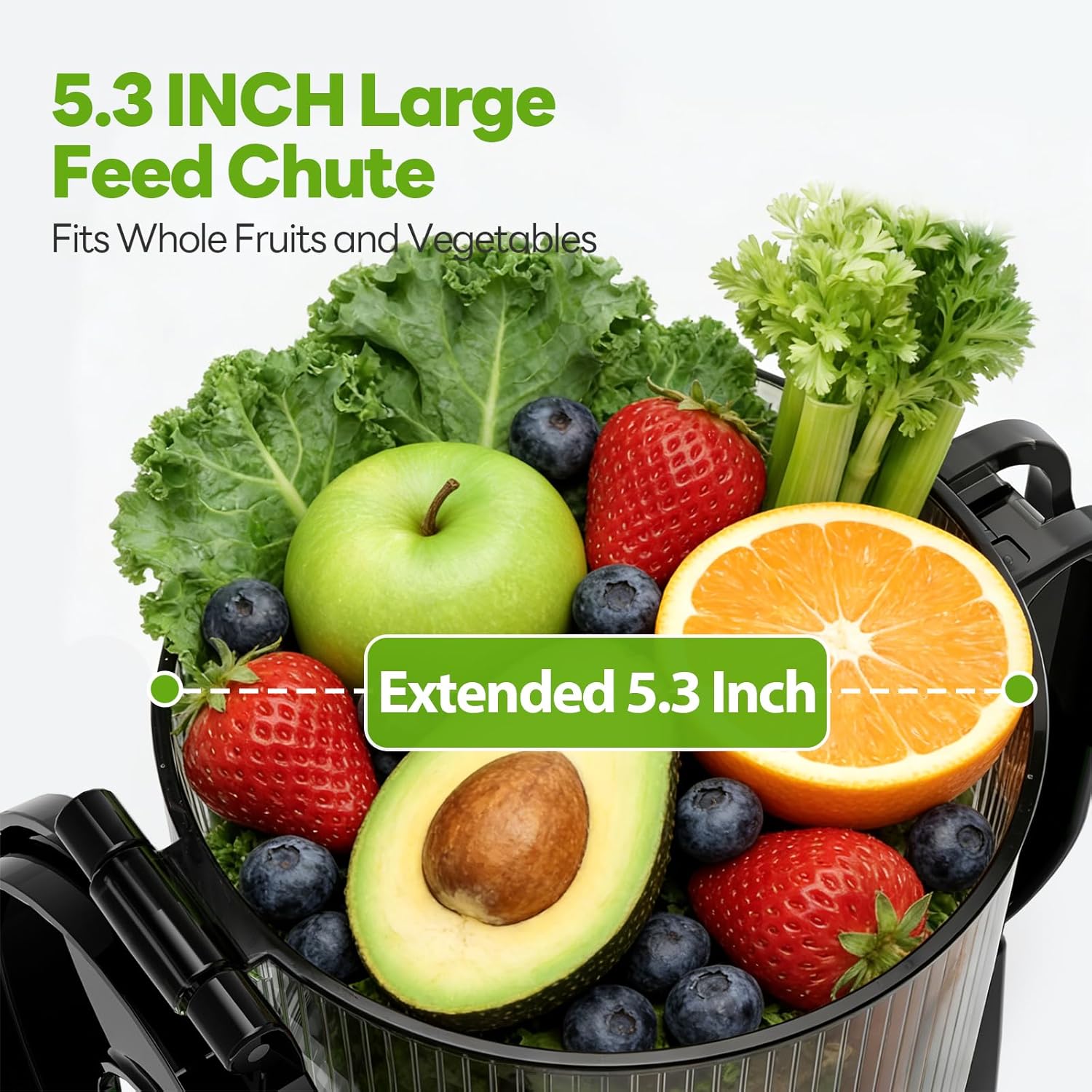 【Extra-Large 5.3″ Wide Feed Chute】 Fit whole apples, oranges, pineapples, and large vegetables with no chopping required. The large feed chute with auto-feeding design lets you juice hands-free and process large batches easily—perfect for busy families, meal prep, parties, and entertaining.